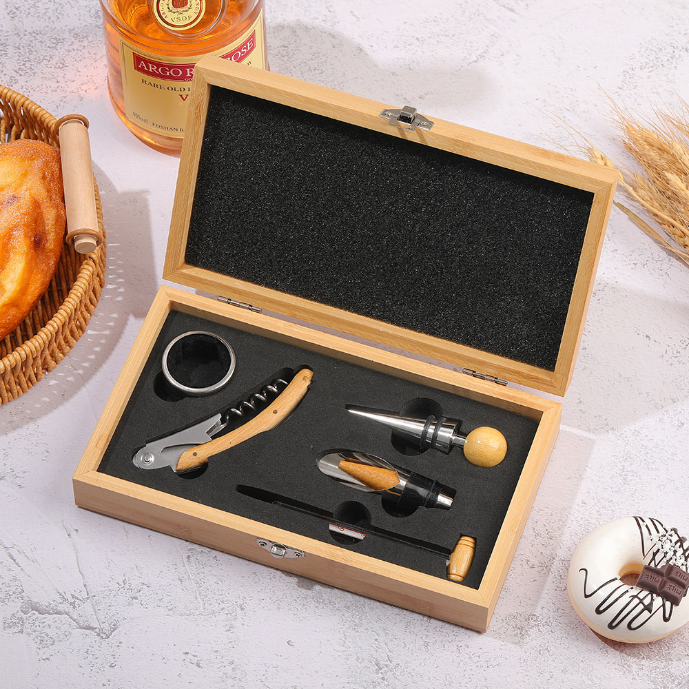 This Bamboo Box Bottle Opener Set is a perfect companion for wine enthusiasts. The various tool accessories are crafted from durable alloy, ensuring superior performance and long-lasting durability. Encased in an exquisite bamboo gift box, it not only serves as a practical tool set but also makes for an elegant present.