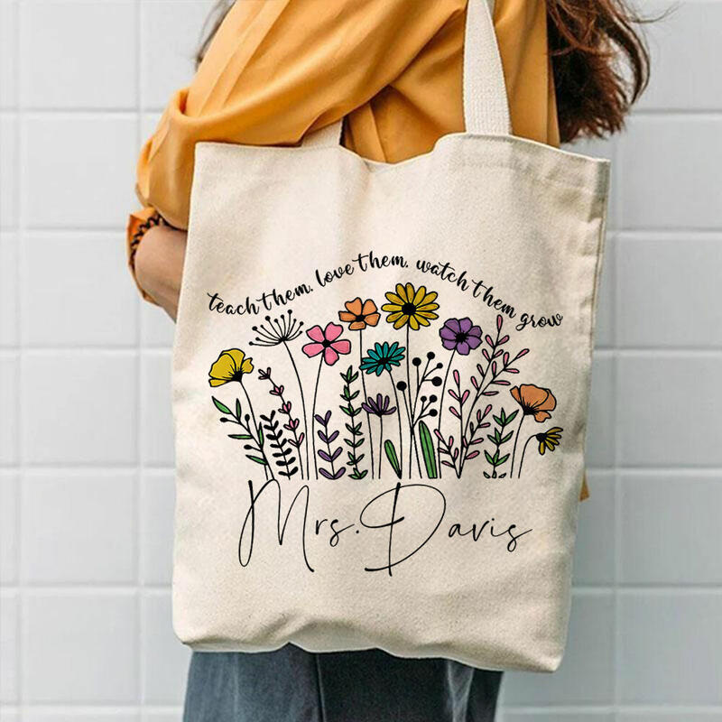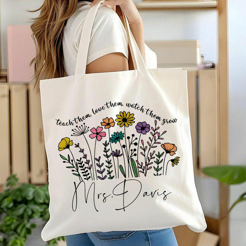 Personalized Tote Bag with Flowers Recyclable Canvas Bag Back to School Gift for Teacher