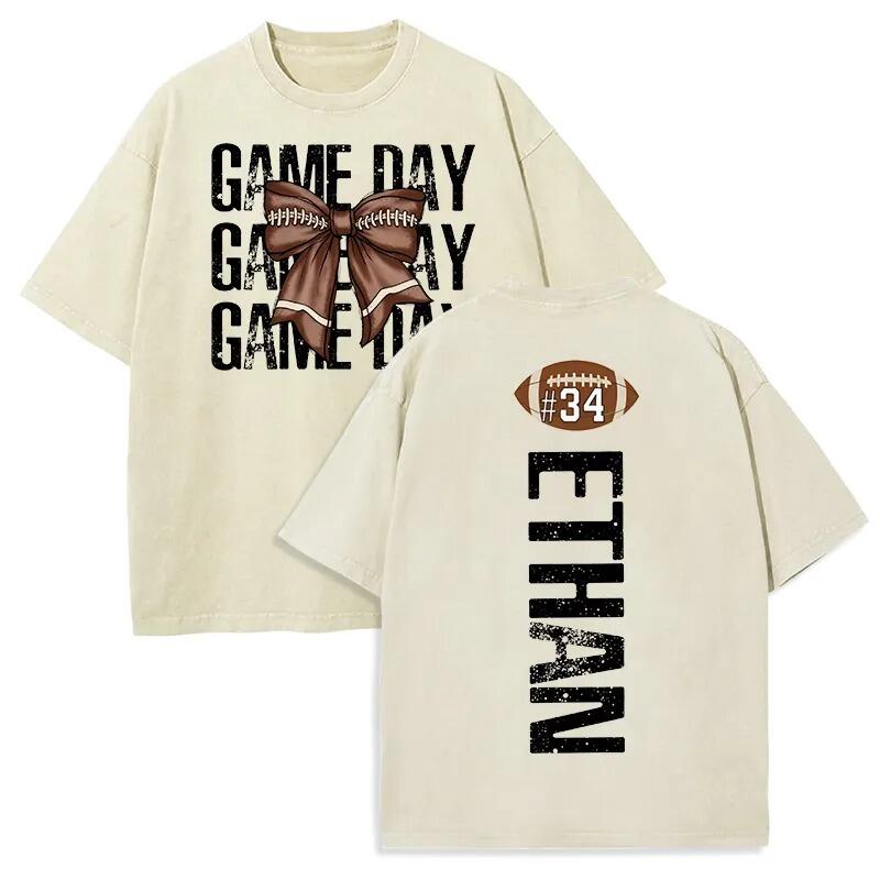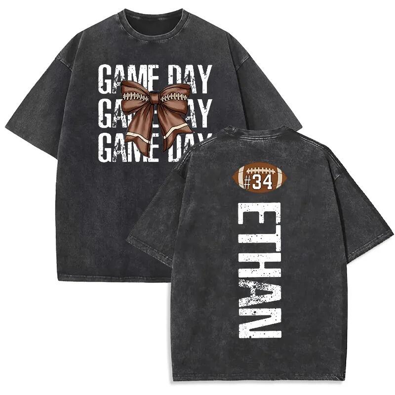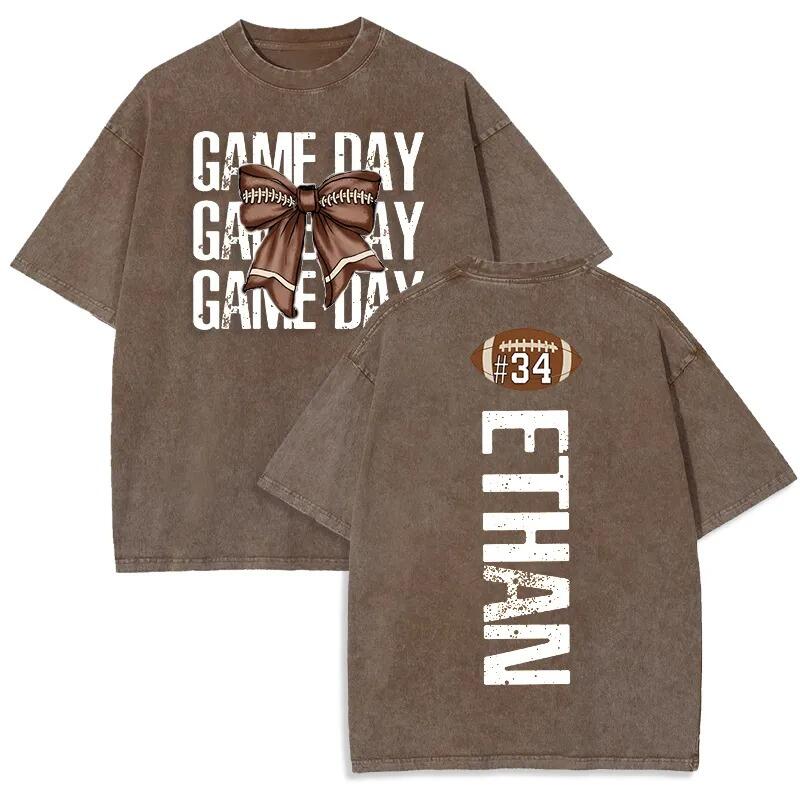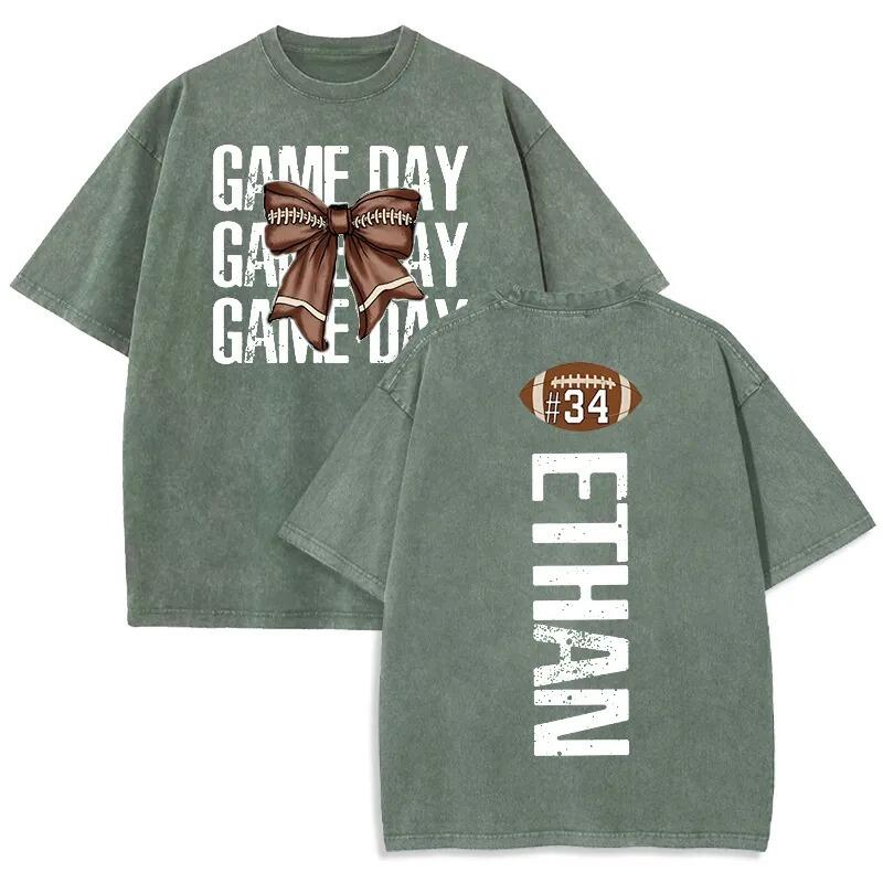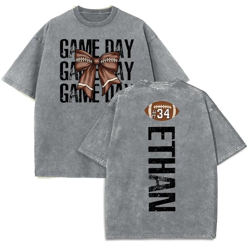 Personalized Washed T-shirt Game Day Custom Name Football Bow Design Perfect Gift for Sports Lovers