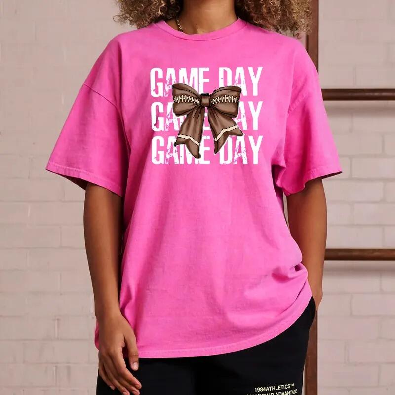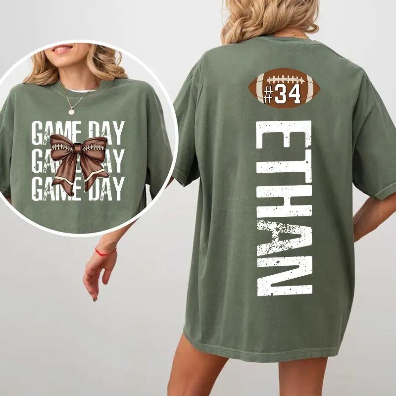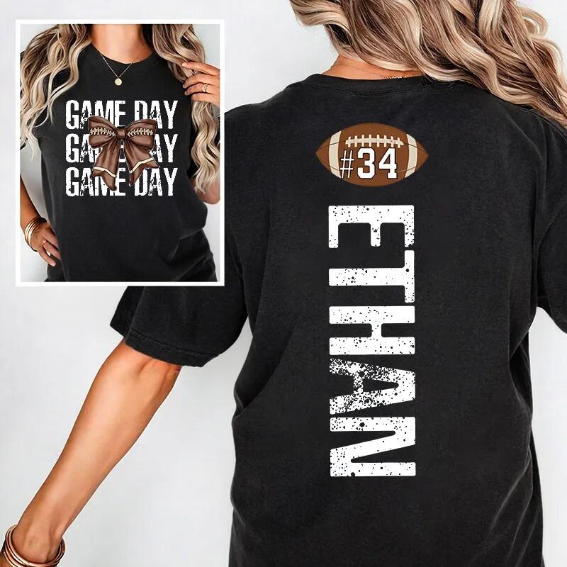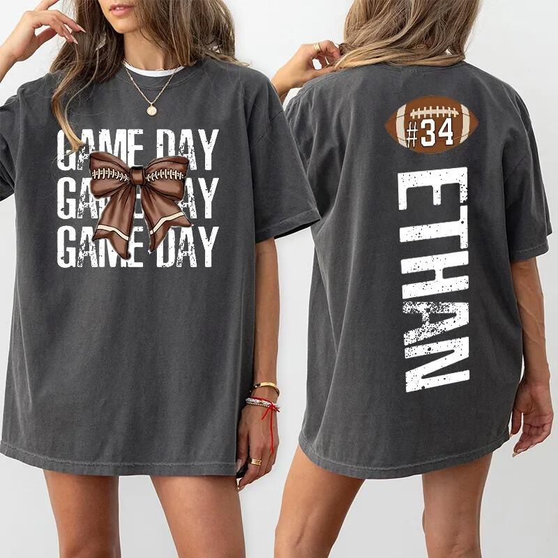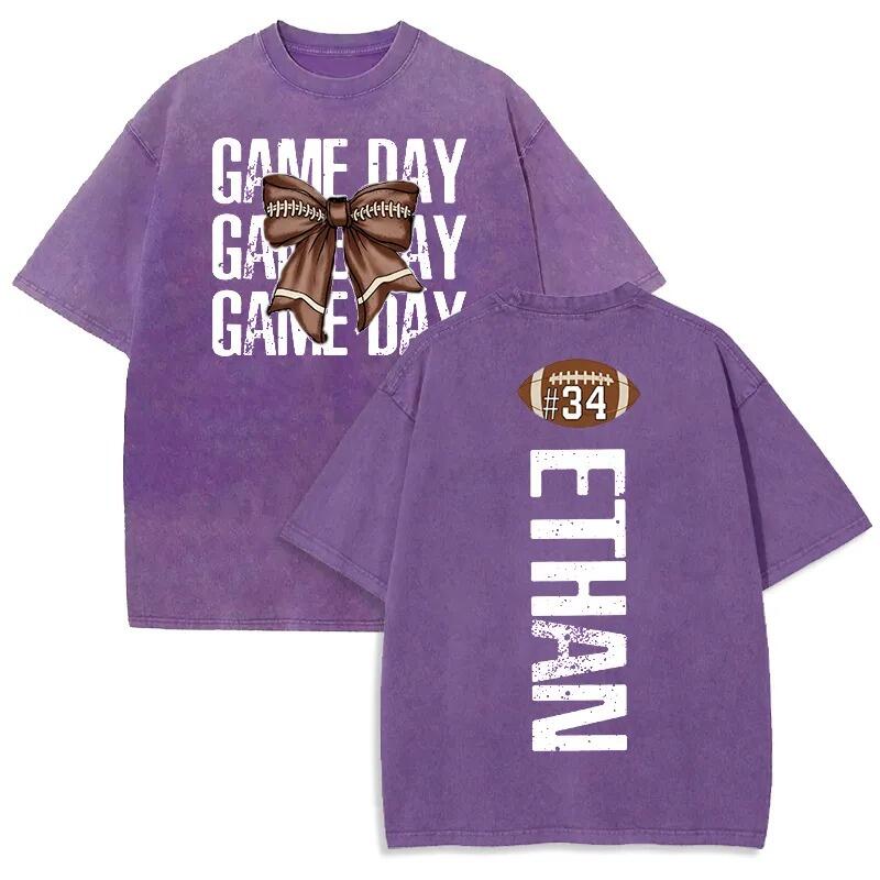 Personalized Washed T-shirt Game Day Custom Name Football Bow Design Perfect Gift for Sports Lovers