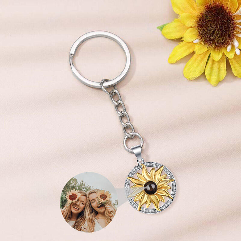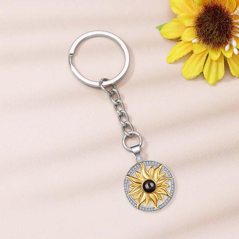 Sterling Silver Personalized Sun Photo Projection Keychain with Diamonds